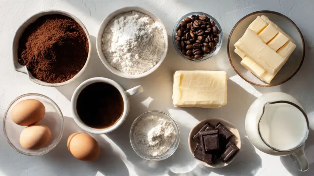 Mocha cake typically includes flour, cocoa powder, sugar, eggs, butter or oil, and milk. These ingredients create a soft, moist texture that serves as the perfect base for coffee flavor.