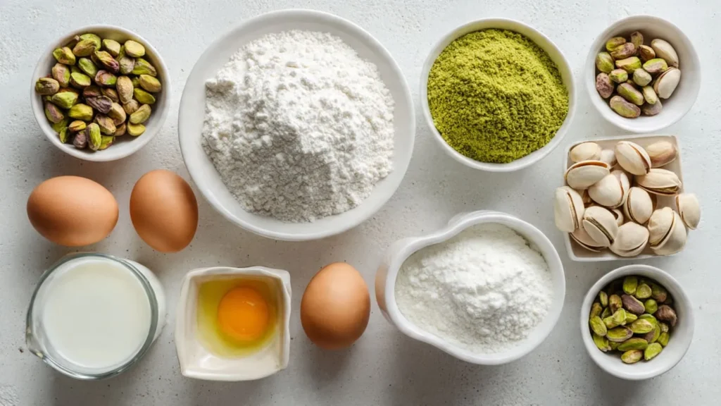 This cake uses standard baking staples such as flour, sugar, eggs, oil or butter, and milk. Together, they create a moist, tender crumb that complements the pistachio flavor.