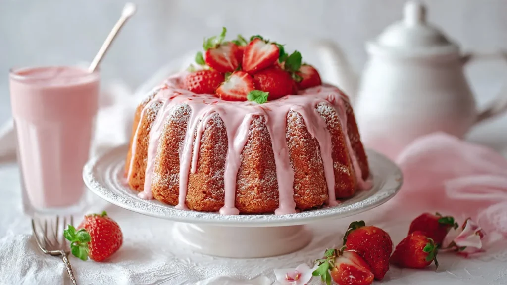 This cake is popular because it blends nostalgia with elegance. The strawberry milkshake flavor feels playful, while the pound cake form makes it perfect for slicing and serving at gatherings.
